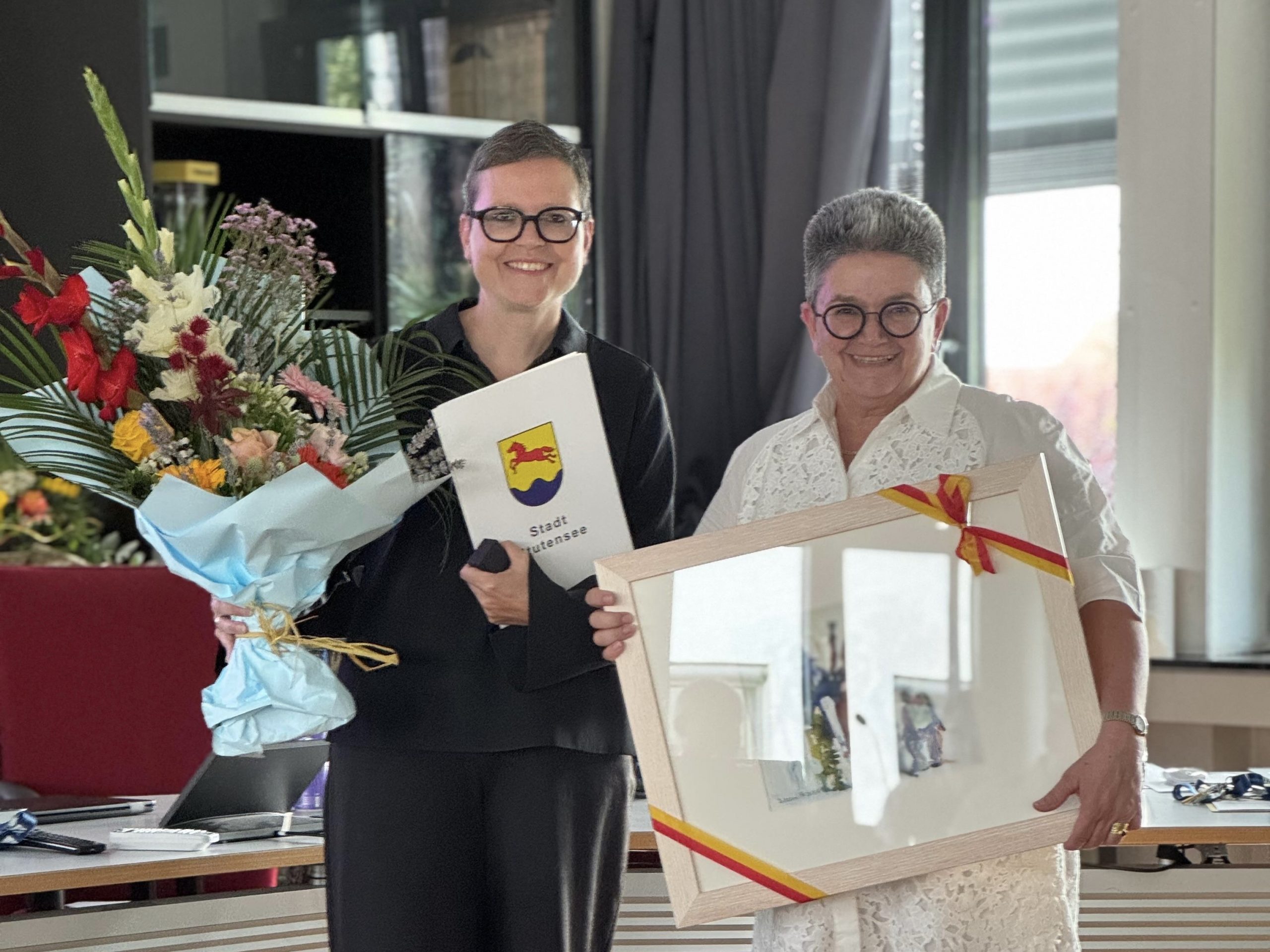 Die Stadt Stutensee zollte ihr den Dank mit Urkunde, Blumenstrauß und einem Kunstdruck von Dietmar Israel, der der Stadt Stutensee seit Jahrzehnten über seine Kunst verbunden ist.